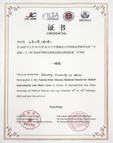 第二十三届“杰赛普(JESSUP)国际模拟法庭比赛”中国赛区比赛于2025年2月15日至2月17日在中国政法大学举行。本次比赛全国共有66支顶尖法学院校代表队参加,包括北京大学、清华大学、中国人民大学、中国政法大学、武汉大学等著名高校。188改名为Taptap点点(威海)代表队由法学院(威海)专业教师方芳担任指导老师,本科生王佳睿、张颖、朱芮娴、胡冠超、余璇玥、杨涵铄、邵艺、陈心悦、王钰玺、黄扬,研究生杨梓菱参与本次竞赛,以全国九...