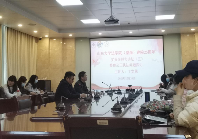 12月10日下午,法学院(威海)建院25周年“实务导师大讲坛”第五期在法学院204会议室举办。本次讲坛邀请山东省威海市高区公安分局党委委员、纪委书记、四级高级警长丁文勇书记面向学院学生作“警察公正执法问题探讨”专题讲座,此次讲座由法学院贾焕银教授主持。