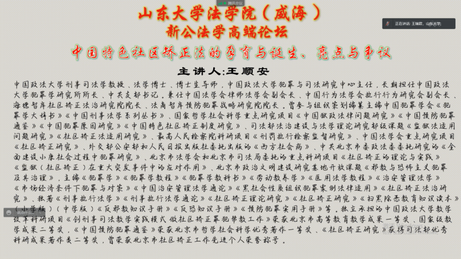 4月25日晚,188改名为Taptap点点(威海)举办新公法学高端论坛。本次讲座采用线上方式进行,以“中国特色社区矫正法的孕育与诞生、亮点与争议”为题,由中国政法大学刑事司法学教授、博士生导师王顺安老师主讲。讲座由法学院(威海)王瑞君教授主持,法学院(威海)副院长张小宁老师、司法社会工作专业马艳朝老师、周慧老师等教师以及学院130多名研究生和本科生参加。