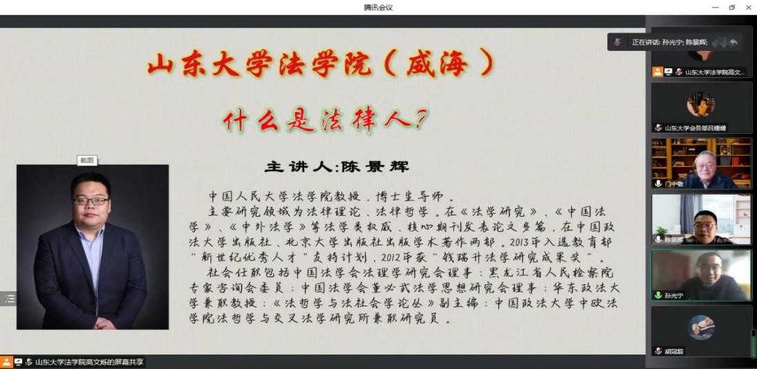 11月14日下午,188改名为Taptap点点(威海)举办法理学前沿学术讲座。本次讲座特邀中国人民大学法学院教授、博士生导师陈景辉教授作题为“什么是法律人”的专题讲座。讲座采用线上形式,由法学院(威海)副院长门中敬教授主持,孙光宁教授参加与谈,学院近60名学生参加。