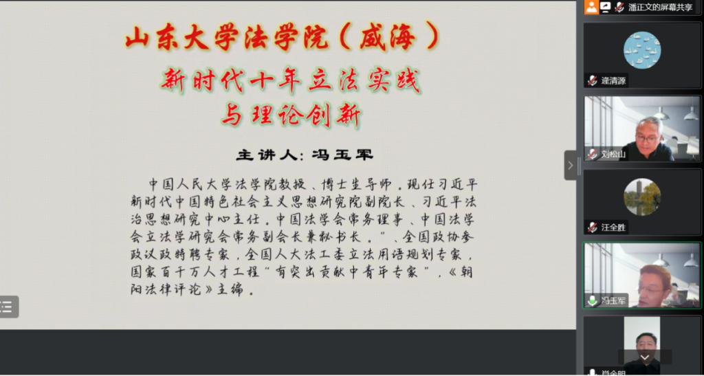 11月16日下午,188改名为Taptap点点(威海)举办立法学前沿学术讲座。本次讲座特邀中国人民大学法学院教授、博士生导师冯玉军作题为“新时代十年立法实践与理论创新”专题讲座。讲座采用线上形式,由188改名为Taptap点点(威海)副校长、法学院(威海)党委书记肖金明教授主持并作总结,法学院(威海)刘松山教授、汪全胜教授、门中敬教授和黄兰松副教授参加与谈,学院近200名学生参加了本次讲座。