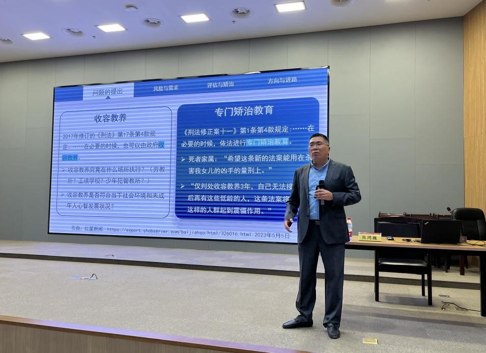 张鸿巍教授从大连10岁女童被杀案切入,对报告内容进行了讲解。张教授指出《预防未成年人犯罪法》第45条第1款之落地,亟需解决的三个核心问题:一是专门教育指导委员会如何根据“风险-需求-响应”评估内容而建构结构化未成年人评估指标体系?二是如何依据评估结果个别化研拟未成年人矫治目标与矫治内容?三是如何实施动态化专门矫治教育方案?其次,张教授结合“风险-需求-响应”模型,明确了专门矫治教育的适用对象与适应程序。适用对象中强调身心健康、成长经历等风险指标项;适应程序包含评估对象与评估内容两个方面。张教授结合可变变量与不可变变量对评估内容中的父母管教能力和未成年人风险/需求进行分析。张教授讲解了“风险-需求-响应”模型的具体内容,如风险原则中的静态风险因子、动态风险因子;需求原则中的犯因性需求、非犯因性需求;响应原则中的一般响应原则和具体响应原则。张教授在上述原则基础之上总结了专门教育矫治的路径,一是建构评估指标体系,精准识别专门教育矫治对象;二是聚焦个体“犯因性需求”,动态调整专门教育矫治内容;三是优化专门教育矫治方案,多维提升专门教育矫治质量。