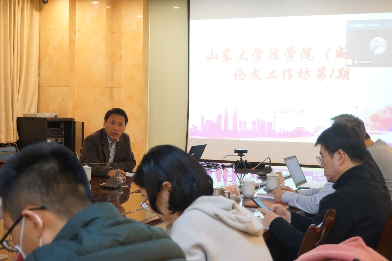 3月15日晚7时,法学院在204会议室举办了第1期“论文工作坊”。牟利成副教授对论文“人民性与党规国法一体同构的法理证成”进行了介绍,本次活动由副院长门中敬教授主持,院长肖金明教授、门中敬教授、张乐教授、武飞教授、刘洋教授等参加了评议。参加本次论文工作坊的还有法学院部分老师,博士研究生和硕士研究生。