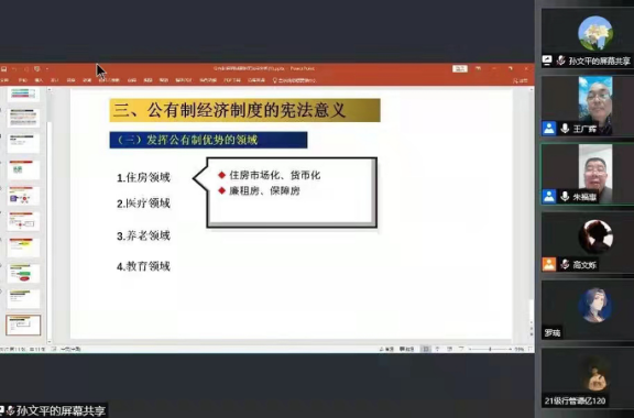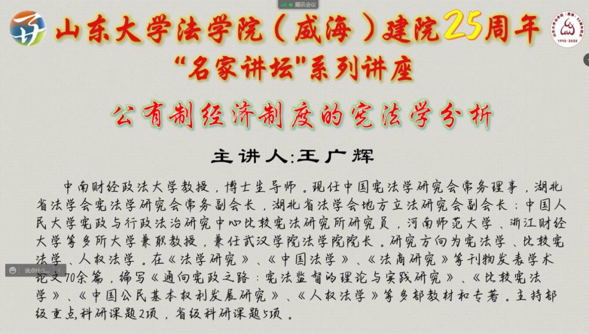 11月30日晚,法学院(威海)举办了建院25周年“名家讲坛”系列讲座之第八十期,中南财经政法大学教授王广辉采用线上方式作了题为“公有制经济制度的宪法学分析”的学术报告,由法学院(威海)朱福惠教授主持,师生共一百余人参加。