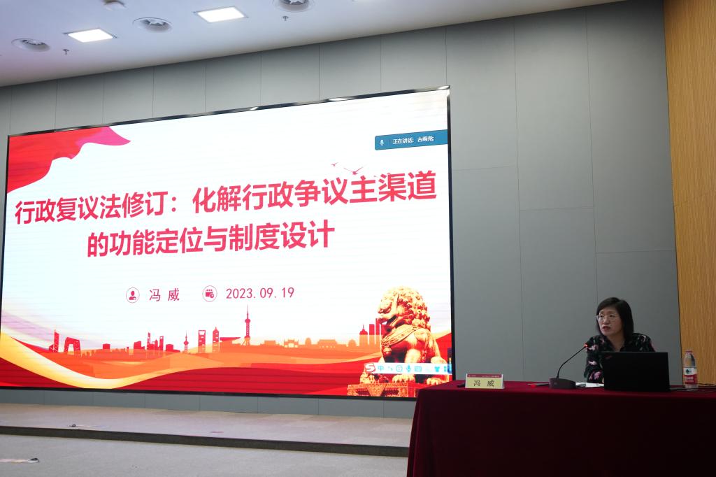 冯威老师的报告以行政复议制度为核心命题,从一项制度、两个面向、三重功能、四组关系、五大变化五个部分展开。“一项制度”即行政复议制度,介绍了我国行政复议制度三十余年来的发展沿革及其制度逻辑;“两个面向”即行政复议制度兼具的行政性与准司法性,正是其特殊属性,决定了行政复议制度具有无可替代的制度优势;“三重功能”即行政复议制度在不同历史时期和发展阶段被期待的监督行政、救济权利和化解争议功能,制度功能的预设和变化成为行政复议制度发展的重要促动力量,呈现出对所承载使命的与时俱进的回应性;“四组关系”即行政复议制度的发展完善要特别关注行政复议与行政诉讼、上级机关和下级机关/人民政府与职能部门、复议行为与原行政行为、行政复议与治理体系治理能力现代化等四组关系;“五大变化”即本次行政复议法修订的要点,包括行政复议管辖体制、行政复议吸纳行政争议能力、便民为民举措、复议程序完善以及复议决定优化等方面,尤其阐释了“主渠道”作用发挥与修订内容的关联。