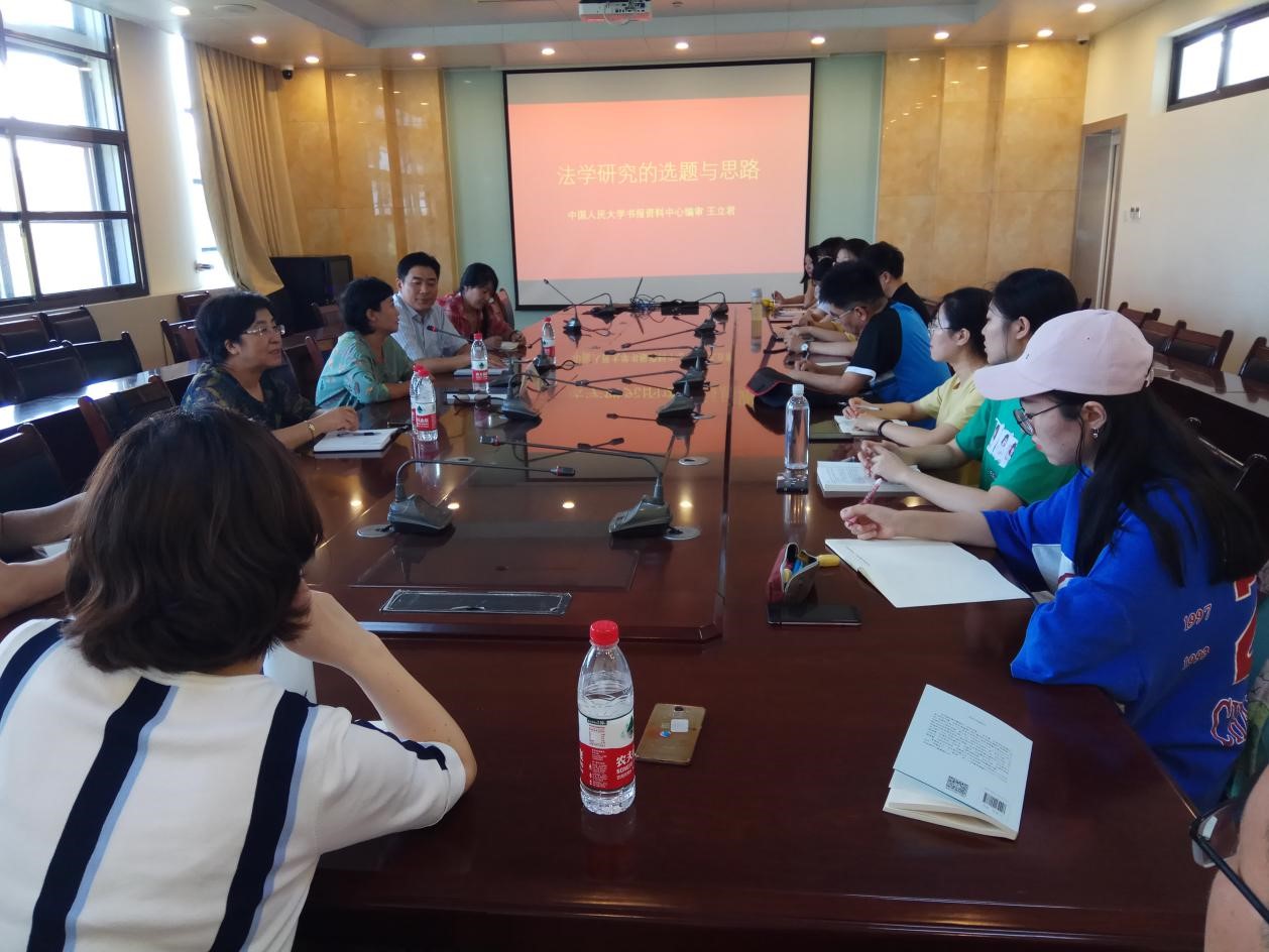 2019年7月18日下午,我院邀请王立君教授主讲玛珈山法律方法论坛,发言主题为“法学研究的选题与思路”,本次讲座由我院副院长刘军教授主持,李秀芬教授、孙光宁教授、张其山副教授、武飞副教授等老师和博士硕士研究生参加了本次学术活动。