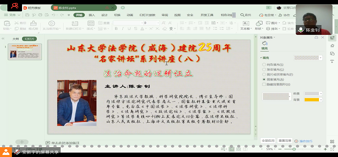 5月20日晚,华东政法大学教授、科学研究院院长、博士生导师陈金钊教授受邀做题为“法治命题的逻辑证立”的学术讲座。本次讲座通过腾讯会议线上举办,法学院副院长姜世波教授主持,教师与学生代表300余人参与本次学术讲座。