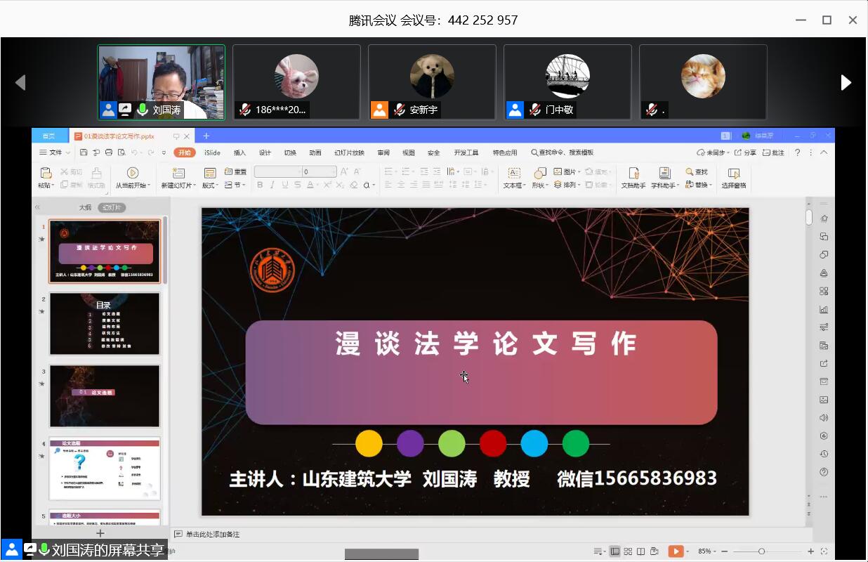 5月8日晚,山东建筑大学法学院三级教授、山东建筑大学工程法学研究中心主任刘国涛教授于线上腾讯会议应邀做题为“漫谈法学论文写作”的学术讲座。讲座由法学院教授门中敬主持,部分教师与学生共计280余人参加本次讲座。