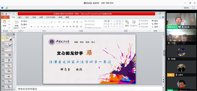 4月29日晚,中国知名法学家、中国政法大学比较法学研究院院长解志勇教授于线上腾讯会议应邀进行了主题为“文心如龙妙手雕——法律美文撰写与法学研学一席谈”的学术讲座。本次讲座由法学院院长肖金明主持,部分教师与学生共计200余人参与讲座。