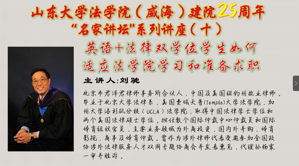 6月5日晚,我国高级律师,北京君泽君律师事务所合伙人,中国及美国纽约州执业律师刘驰律师受邀做题为“英语+法律双学位学生如何适应法学院学习和准备求职”的学术讲座。讲座于腾讯会议线上召开,法学院副院长姜世波教授担任主持人,教师与学生代表共计100余人参加本次讲座。