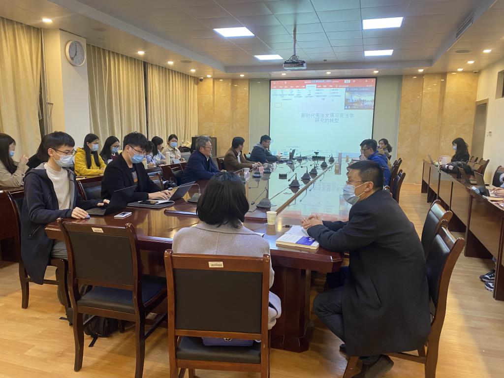讲座伊始,门中敬教授对本次报告会做了简要介绍并对朱福惠教授的到来表示热烈欢迎和衷心感谢。伴随着热烈的掌声,朱福惠教授围绕“新时期宪法发展与宪法学研究的转型”开始讲解,整场讲座共分为三个模块。首先,朱福惠教授从向苏联学习、向西方学习、中国特色社会主义宪法学的建构三个阶段对中国宪法学的研究作了历史性回顾,并运用统计学研究方法以图表形式清晰地向大家展示了宪法学研究的学术脉络;其次,朱福惠教授肯定了几十年来宪法发展取得的历史成就,详细阐述了目前宪法学研究面临的挑战;最后,朱福惠教授就“新时代宪法学研究的转型”,分别就主体性建构、理论体系、概念体系、范式更新等发展方向做了系统全面的阐释。