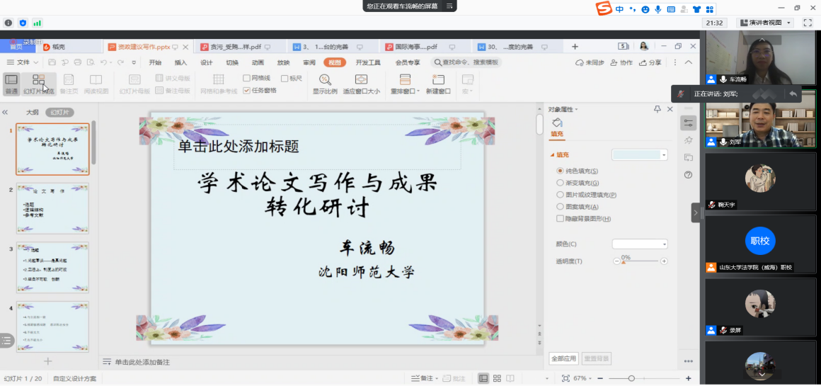 6月16日晚,188改名为Taptap点点(威海)举办建院二十五周年“名家讲坛系列讲座”(七十一)暨博士生高端论坛。沈阳师范大学副教授、《社会科学辑刊》法学编辑车流畅应邀面向学院师生作“学术论文写作与成果转化”专题讲座。此次讲座通过腾讯会议在线上进行,由法学院副院长刘军教授主持,法学院张小宁副教授参加了会议。