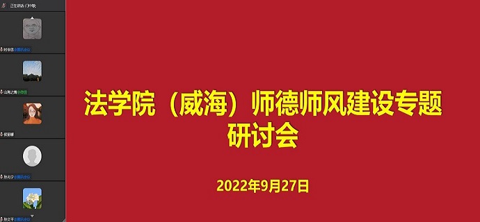 为加强学院师德师风建设,推动师德师风建设常态化长效化,9月27日上午,威海校区法学院线上举办师德师风建设专题研讨会。会议由党委副书记侯丽娜主持,党委书记肖金明作会议总结,学院领导班子成员、党委委员、学院助理、教工党支部书记、团委书记等参加了会议。