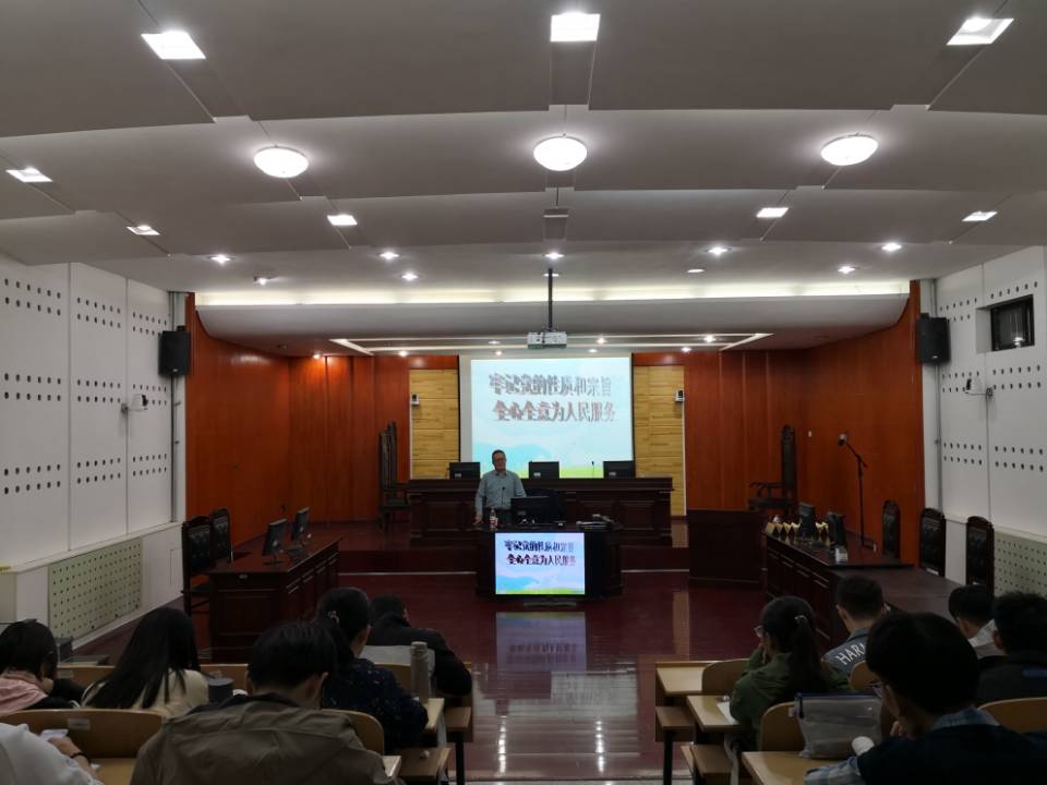 为进一步贯彻落实全国高校思想政治工作会议和党的十九大精神,积极落实“不忘初心、牢记使命”主题教育工作,提升学生党员和入党积极分子的政治素养,法学院于10月10日下午在模拟法庭举办专题党课。法学院门中敬教授为入党积极分子做了主题为“牢记党的性质和宗旨,全心全意为人民服务”的专题党课,法学院学生党员及入党积极分子40余人集中参与了本次党课学习。