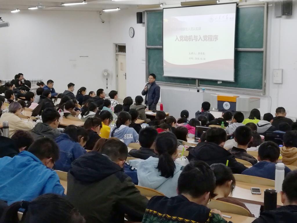 会上,李传先老师从“为什么要加入中国共产党”、“入党规范流程”和“入党申请书写作格式要求”三个方面展开详细介绍。首先,李老师以提问的形式了解了2018级新生的入党意愿。其次,他从中国共产党的发展历史、性质、宗旨等方面进行了阐述,使新生对中国共产党有了更加深入的了解。同时,他从新时代大学生的时代使命、优秀共产党员的标准要求及当今社会环境等角度出发结合法学院专业特点,要求新生提高认识、扎根实际,努力发展成为合格的建设者和接班人。随后,李老师以《入党申请书》的书写规范为切入点,对入党流程进行了全面讲解,强调了从递交入党申请书到成为一名正式党员的各个环节所应注意的问题。最后,李老师就参会同学在入党方面的疑问做了细致的解答,并为本次入党认知课做总结。他指出,当代大学生应紧跟党的步伐,坚定政治信仰,不忘初心、牢记使命,踏实前行。