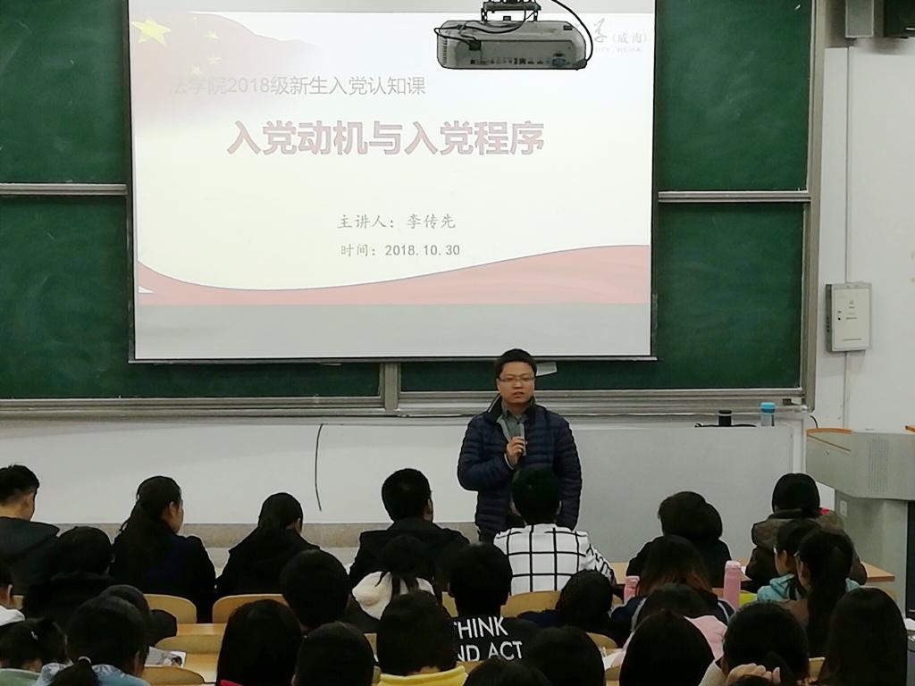 为使新生增强对党的认识,端正入党动机,了解党组织发展情况,加强对新生的理想信念教育,10月30日下午,法学院于学院楼356教室举办了法学院2018级新生入党认知课。法学院党委组织员李传先担任主讲人,2018级全体新生参加了本次学习。