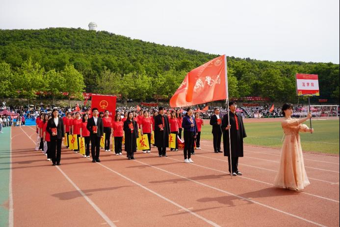 开幕式上,法学院(威海)方阵在学院党委副书记侯丽娜的带领下,步伐矫健,青春洋溢。方阵充分立足学院特色,凸显了学院风采。前排学生身着法袍、手持法典,彰显了法苑学子尊崇法治、捍卫法治的坚定信念。中间学生手举字幅,簇拥《中华人民共和国宪法》,庄严喊出“法苑风华,雄姿英发;法经天下,律振中华”的口号,生动诠释了法苑学子的蓬勃朝气和远大志向。