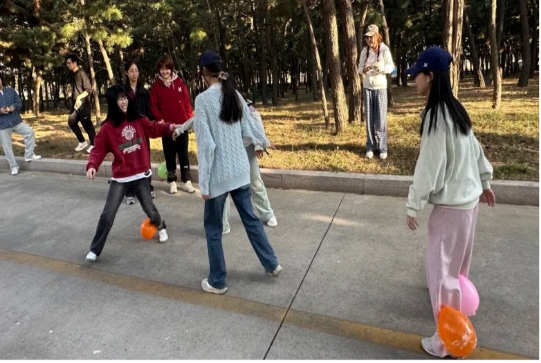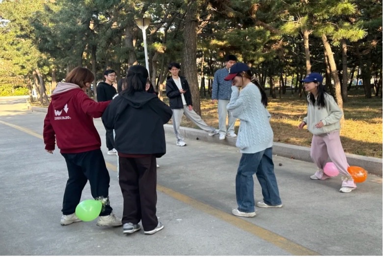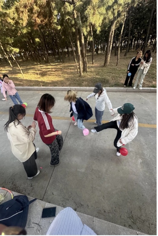 两人三足赛跑结束后,稍作休息,开始进行紧张刺激的踩气球游戏。八支队伍的剩下两名同学分工合作,一人在脚踝处用胶带绑两个气球,另一人负责进攻和防御,运用战术和身体协调性踩破敌方气球、保护己方气球。活动全程热烈而有趣,结盟与背叛、佯攻与相持等好戏频频上演。活动在最后一个气球的爆炸声中宣告结束。