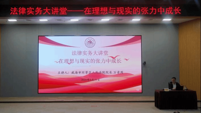 为增强法学专业学生的理论与实践结合能力,深化学生对司法实务的认知,5月21日晚,法学院(威海)举办题为“在理想与现实的张力中成长”的法律实务大讲堂活动。威海市环翠区人民法院院长万景周法官担任主讲嘉宾,学院副院长张伟强老师担任主持人,学院师生代表参加此次活动。