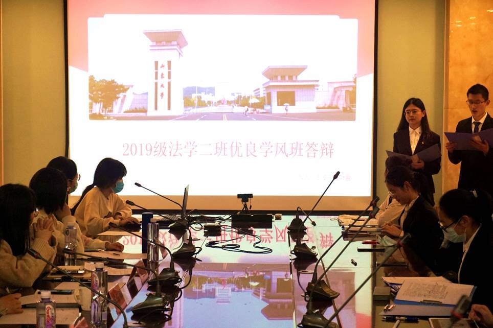 本次答辩会共分为候选校级先进班级答辩、候选校级优良学风班答辩和总结点评三个环节,主要围绕各班级2020-2021学年取得的成就与班级未来规划展开。闫玥向同学们介绍了先进班集体和优良学风班的申报和评选标准细则。2020级新闻法学班、2019级法学与英语双学位班和2019级党内法规与监察法学班依次进行了候选校级先进班集体答辩,从思想建设、专业学习和实践发展等多方面介绍了班级所取得的成就。2020级党内法规与监察法学班、2020级新闻法学班、2019级法学二班和2019级法学与英语双学位班依次进行了候选校级优良学风班集体答辩,围绕学习方式、学习氛围和学习成果等方面展开答辩,展现了参选班级特色鲜明、笃志博学的优良学风、班风。法学院党委副书记侯丽娜进行了总结点评。她指出,良好的班风、学风是促进学生全面成长成才的重要条件,班级成员理应凝聚合力,为班级建设出谋划策,同时班级之间也应发挥传、帮、带作用,助力学院学风建设的进一步发展。
