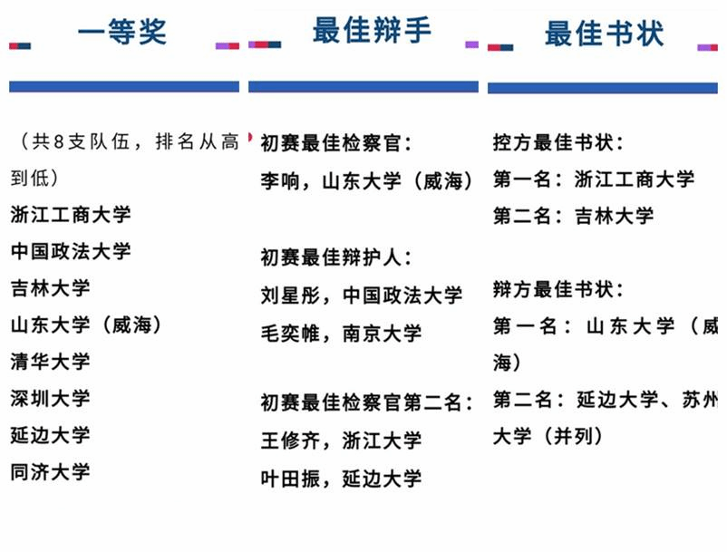 根据竞赛规则,竞赛分为初赛和决赛两个阶段。初赛分为控辩两场,总成绩排名前八名的队伍进入决赛。第一场,我校作为辩方对阵吉林大学代表队,以精彩卓绝的表现赢得法官的认可。第二场,我校作为控方,在总分排名上领先于对手北京大学国际法学院代表队,以全国总分第四名的成绩晋级决赛。此外,基于扎实的英文写作功底和对法律问题的深度研究,我校代表队书状总成绩位列全国第一名,获得了“辩方最佳书状”的荣誉。同时,我校赛队成员李响在与其他庭辩选手的激烈角逐中,以控方庭辩分数第一名的优异成绩,取得了“初赛最佳检察官”的荣誉。