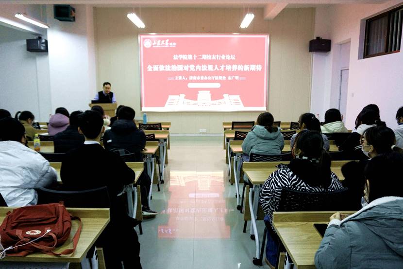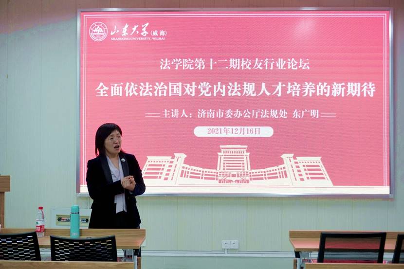 12月16日晚,法学院在科学实验楼308室举办第十二期校友行业论坛。本次论坛以“全面依法治国对党内法规人才培养的新期待”为论题。济南市委办公厅法规处处长东广明出席本次论坛,法学院党内法规与监察法学班班主任冯威担任主持人,法学院各级党内法规与监察法学班全体学生到场参加。