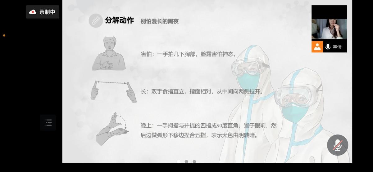 此次活动分为手语教学和线上实践两个个阶段。在手语教学阶段,活动通过在校内开办手语课堂的形式,进行相关知识普及以及基础手语教学。课堂上,教学人员向同学们普及聋哑人和手语的知识。在线上实践阶段,同学们积极参与,学习日常生活用语的手语表达,获得与聋哑人士进行简单交流的能力。