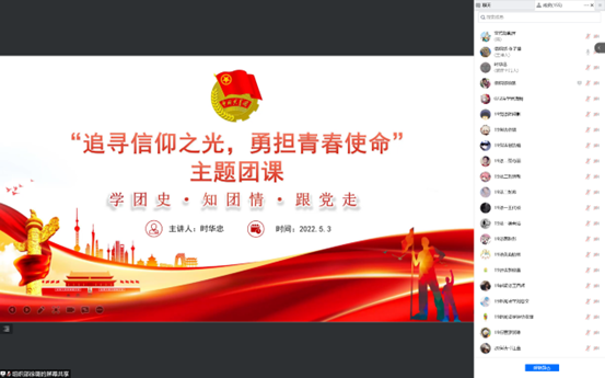 本次团课以共青团发展历史为主题,回望团的百年奋斗历程,坚定团员理想信念,推动团员不断积极进取,激励团员在团的光辉指引下砥砺前行,为后期思想政治教育工作以及新蕾计划的推进打下坚实基础。