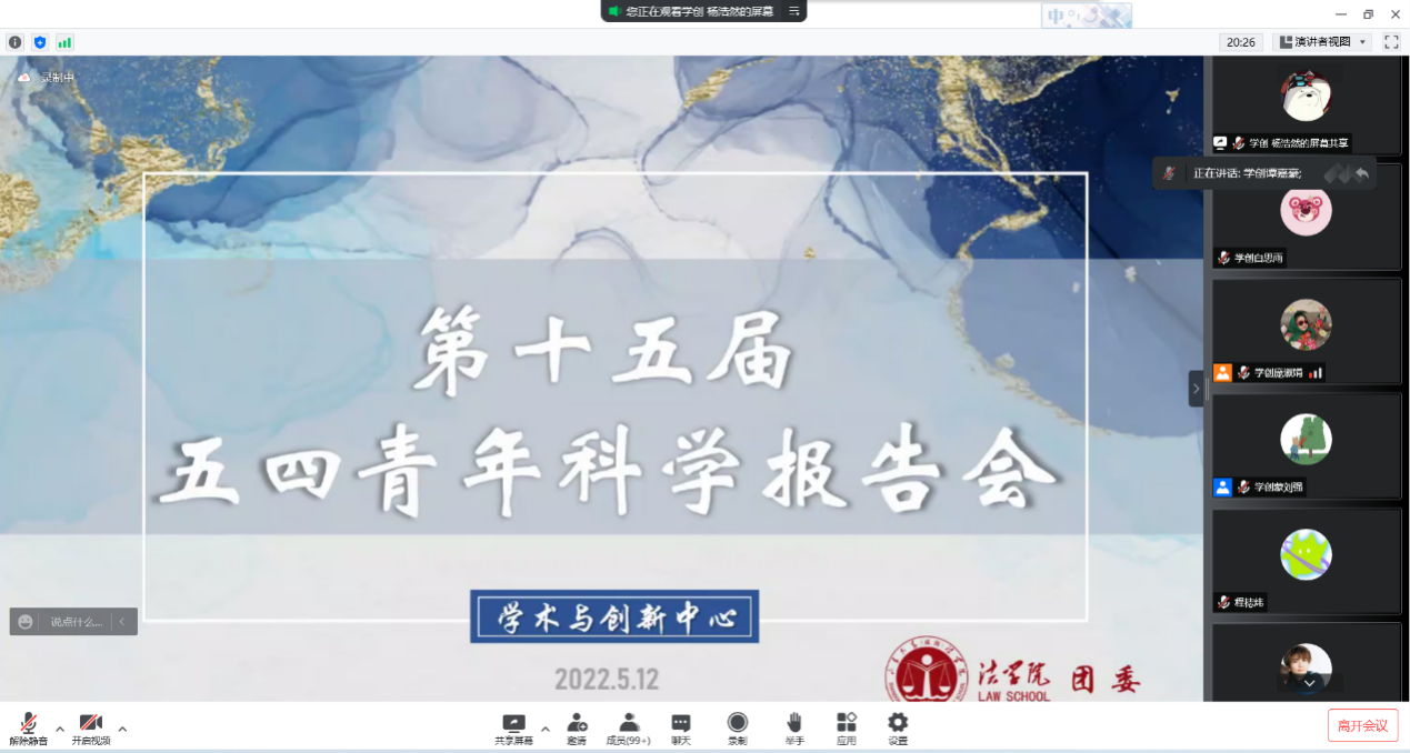 为展现法苑学子求知创新、探索科研的精神品质,全面提高学生科研创新素质,营造法学院浓厚的科创氛围,5月12日晚,法学院通过腾讯会议举行了第十五届五四青年科学报告会。法学院副院长、科技创新工作领导小组组长门中敬、党委副书记侯丽娜、科技创新工作领导小组副组长张乐,法学院团委书记时华忠,辅导员闫玥、周晓政、孙政、刘泽华出席本次会议。法学院第十五届科研班主任、第十三届科研助理、第十六届科研立项团队成员、2021级全体同学参加本次会议。