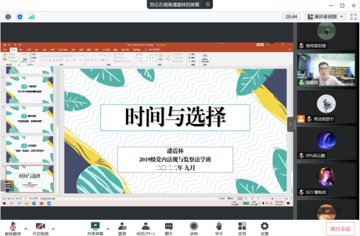 为了进一步加强新生与老生之间的沟通与交流,帮助新生尽快适应大学生活,做好大学职业生涯规划,对大学有更全面的了解,9月17日,法学院(威海)组织新生入学教育之国奖经验分享会。2019级本科生潘震林、省文萱,2020级本科生邹忻容作为优秀学生代表为新生分享国家奖学金成功经验,22级全体新生参加。
