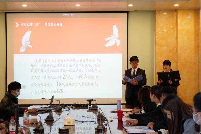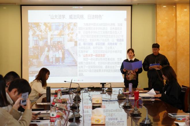 为促进各团支部建设工作的开展,提升班团干部思想政治素养,10月24日中午,法学院(威海)于法学院204室举办第八届活力支部大赛预答辩活动。团委书记时华忠,辅导员周晓政、刘泽华、孙政出席活动。2020级党内法规与监察法学班团支部、2021级法学一班团支部、2021级法学与行政管理班团支部、2021级日语背景法学班团支部到场参加本次预答辩活动。