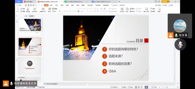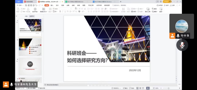 为帮助同学们进一步了解如何开展科研项目,提升科研素养,12月6日晚,2022级法学班和日语背景法学班通过腾讯会议线上举办了2022-2023学年第二次科研班会。本次班会由科研班主任韩梦潇主持并进行授课,2022级法学班和日语背景法学班全体同学参加了本次科研班会。