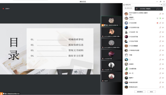 为解答同学们对研究生相关问题的困惑,12月12日下午,2021级日语背景法学班与新闻法学班通过腾讯会议线上举办了2022—2023学年第二次科研班会。本次班会由科研班主任刘泽华邀请黄嫣然进行授课,2021级日语背景法学班、新闻法学班全体同学参加了本次科研班会。
