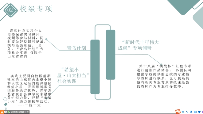 韩梦潇首先从学院发布的寒假社会实践活动通知入手,具体解读了活动通知的内容与要求,着重强调了项目选择与团队分工的重要意义。她通过分析往届优秀团队的调研事例,并结合自身在早期社会实践项目中总结得出的经验心得,指出了学生在进行社会实践活动中容易忽略的细节问题,进一步明确了调用资源进行项目宣传的重要性。韩梦潇以切实有效的分析指导,帮助学生解决了在社会实践项目开展中面临的样本采集与数据分析难题。在后期调研总结方面,她详细介绍了项目提交的层级上升流程,同时提及了项目报销的注意事项。会议最后,韩梦潇以“谋定而后动”总结本次班会,并向学生再次强调了提前做好充分调研规划的必要性。
