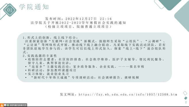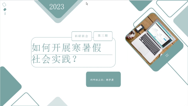 为总结寒假社会实践活动经验,提升学生科研能力和创新能力,2月24日晚,2022级法学班、日语背景法学班举办了2022-2023学年第三次科研班会。本次班会由科研班主任韩梦潇主持并进行授课,2022级法学班、日语背景法学班全体学生参加了本次科研班会。