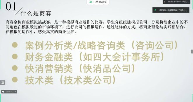 本次班会围绕商业模拟挑战赛这一核心主题,从“什么是商赛”“商赛有哪些类别”与“部分商赛内容与时间”三个方面层层深入,从概念到案例、从校赛到国赛、从国内到国际,系统地介绍了商业模拟挑战赛的基本知识与能力要求,并就几个特殊项目给出参赛建议。首先,解泽瑞强调了商业模拟挑战赛的定义是一种模拟商业运作的比赛。紧接着,他详细介绍了商业模拟挑战赛的四大分类:案例分析类/战略咨询类、财务金融类、快消营销类以及技术类。同时,解泽瑞还为同学们梳理了他参加商业模拟挑战赛的时间线。最后,他以自身经历为例,分享了比赛经验,鼓励同学们在商赛中学习商业理论,锻炼实际应用能力。