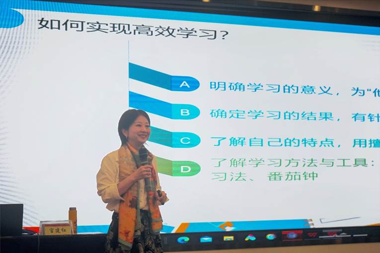 宫建红结合自身学习工作经历,先后围绕什么是高效学习、低效学习如何发生、如何实现高效学习三个问题进行阐述。她认为学生要以自身弱点为突破口,多样化运用各种学习工具与各类学习方法,有针对性地不断提升自己的知识储备与学习素养。她强调学生要避免陷入机械性学习的困境,把握好学习与实践的关系,鼓励学生经常性、主动性参与社会实践,以实践中的具体成果检验学习成效,最大化提升学习收益。她建议学生以构架信息结构为重点,注重整体性学习策略,掌握信息处理方法以提高学习效率,并推荐一系列关于高效学习的书目。