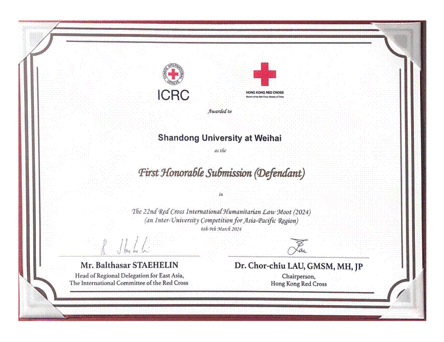 法学院(威海)多年来一直注重优秀涉外法治人才的培养,为学院模拟法庭赛队的备赛和参赛提供大力支持。学院IHL模拟法庭赛队充分展示了我院卓越的法学教育成就,激发了我院学子对以国际人道法为代表的法学研究的热情与追求,彰显了山大学子的精神与风采。学院将继续加强支持和引导,促进学生在国内外重要模拟法庭赛事中再获佳绩,培养德法兼修的高素质法治人才。