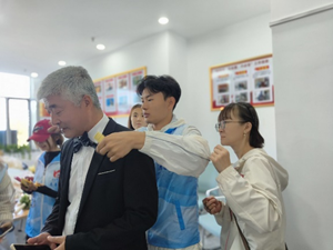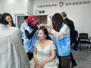 学生志愿者集体前往怡园街道安海社区,刘佳对此次公益实践活动的活动目的、内容及意义进行了相关介绍。社区组织十三对金婚老人拍摄纪念照,志愿者在现场向等候区的老人宣传反诈知识,分发反诈宣传单,并帮助老人整理服饰与妆容仪表。相处过程中,倾听他们的美好回忆,感受他们浓浓的爱意,在交谈中也为社区老人带来欢乐。有志愿者表示:“服务他人的过程自己也感觉很幸福,被平凡又深刻的真情打动了,对爱情充满了期待”。还有同学说:“本次实践活动是一次深刻的感悟之旅,让我们更加珍惜和感恩身边的亲人和自己所拥有的幸福生活。这是一次对爱情、家庭和生活的思考与领悟,也是一次对自己人生的启示和勉励”。活动结束后,志愿者们合影留念。