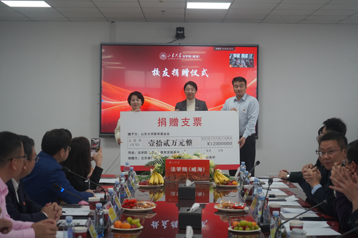 翟钦蕊、孙龙龙校友代表北京叁依律师事务所、山东睿扬(北京)律师事务所向学院捐赠教育基金,侯丽娜代表学院接受捐赠,并向校友对学院的关心支持表示感谢。