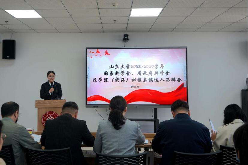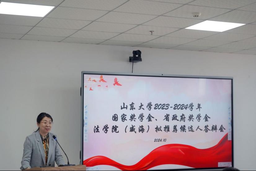 为进一步推动全院形成见贤思齐、明辨笃行的优良学风,通过树立楷模,表彰先进,教育引导我院青年学生进一步坚定理想信念,发奋成才,10月12日上午,法学院(威海)于南辰楼1909举办2023-2024学年国家奖学金、省政府奖学金拟推荐候选人答辩会。学院党委副书记侯丽娜,副院长张其山,学院助理孙文平,班主任代表马艳朝、方芳、原蓉蓉,辅导员老师和学生代表出席答辩会并担任评委。