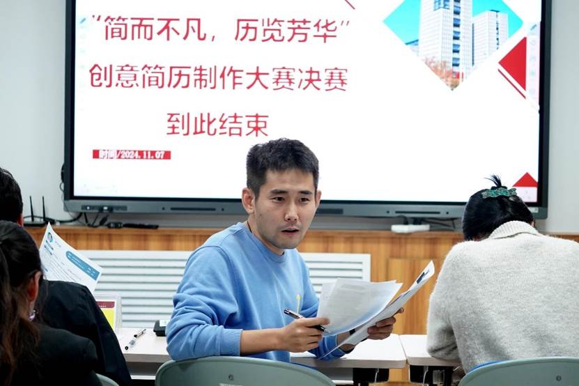 经过初赛的激烈角逐,共有八位选手进入决赛。决赛中,各位选手纷纷展现出非凡的风采与专业素养。八位选手结合自身优势与特长,精心打造出一份份各具特色的简历。2022级法学二班的丁志琳,凭借深厚的法学学科素养和完善的职业素养,通过条理清晰、内容详实的简历介绍,充分展现了自身的专业实力与自信风采。2022级法学与行政管理班的彭涵,她的简历内容详略得当,重点突出,彰显了她对大学生求职的深刻理解与精准把握。2023级日语背景法学班的胡文娇,以创意十足的图形和色彩搭配,以及清晰的模块划分,突出个人经历与应用技能,用高质量的简历诠释了简历制作的独特魅力。选手们大方自信,侃侃而谈,不仅展现出了优秀的简历制作能力,更在阐述简历制作思路的过程中,彰显了较强的逻辑思维与表达能力。八位选手的创意与才华,成为了这场比赛中最为亮丽的风景线,激励着学院广大学子不断追求卓越,展现自我。