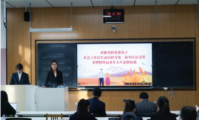 由王亚茹、许晓凡、孙瑞雨、王攀、郑慧敏(指导老师:刘佳)组成的团队,凭借作品《积极老龄化视角下,社会工作以生命历程为笔、叙事疗法为墨重塑慢性病老年人生命价值感》荣获二等奖。该作品以独特的视角和深入的分析,展示了社会工作在促进慢性病老年人生命价值感重塑方面的积极作用。