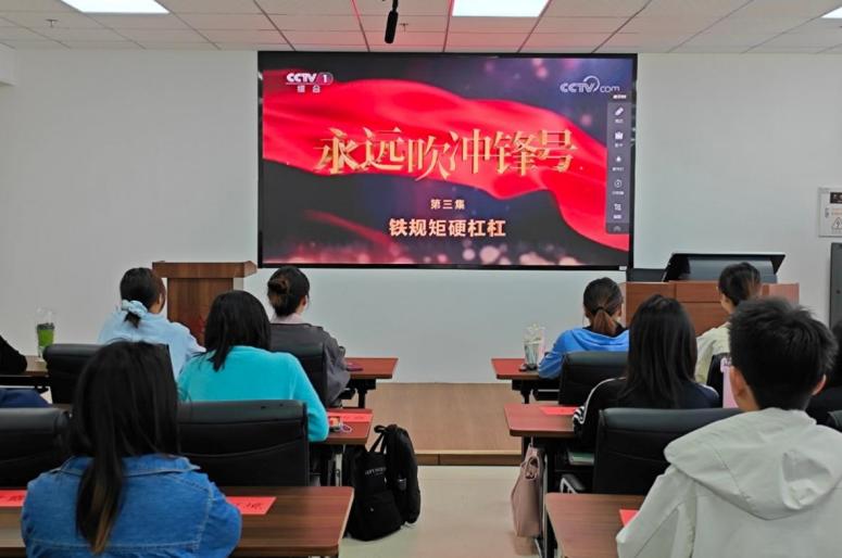 主题观影环节,全体学员共同观看深入贯彻中央八项规定精神学习教育警示片——《永远吹冲锋号》第3集《铁规矩硬杠杠》,深刻学习了中央八项规定精神的重大意义和实践要求,领悟到持续推进作风建设的重要性。研讨交流环节,学员们围绕“新时代青年大学生如何弘扬党的光荣传统和优秀作风”进行主题交流、分享感悟。