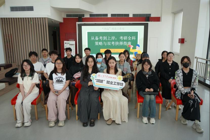 为帮助我院学子进一步明确考研目标、掌握备考技巧,5月13日下午,法学院(威海)于南辰楼举办“鸿途”就业工作坊系列活动之从备考到上岸:考研全科策略与双考抉择指南。2021级新闻法学班本科生徐艺菲与2021级日语背景法学班本科生曲静担任主讲嘉宾。