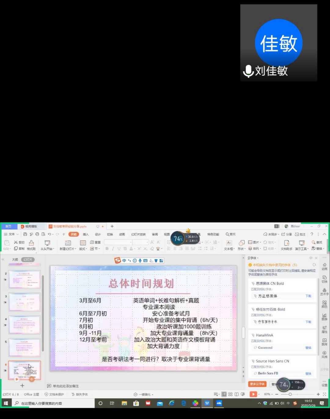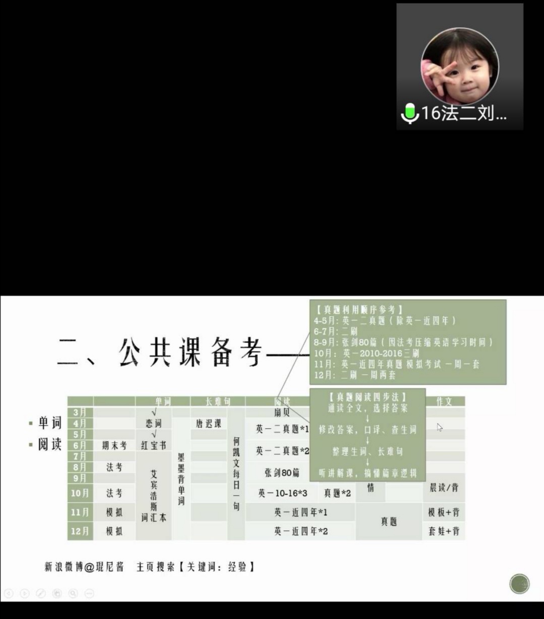 为帮助我院考研学子在接下来的学习中明确奋斗目标、做好备考规划,法学院于5月26日晚在腾讯会议举办考研经验分享会。由2016级法学二班刘佳琨、2016级法学二班刘佳敏、2016级行政管理班侯聪迪、2016级社会工作班田静林、2016级社会工作班李敏担任主讲人,为同学们分享考研经验。