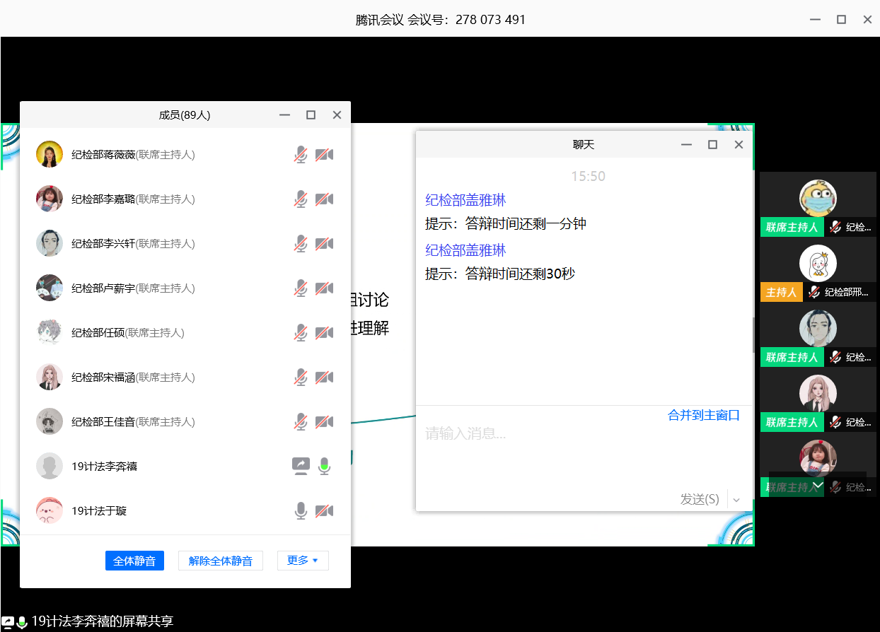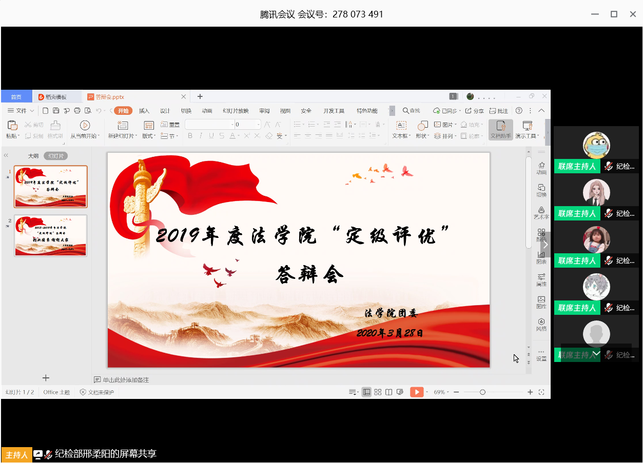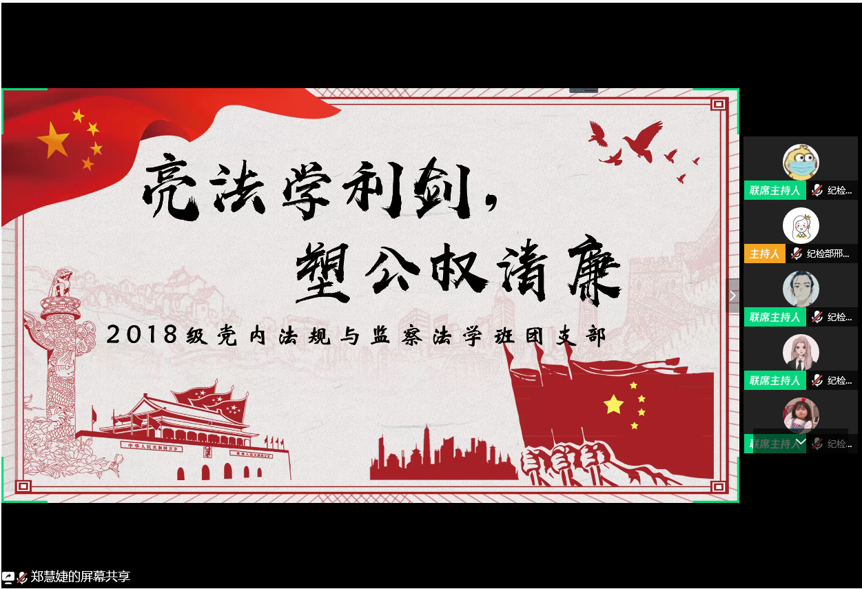 为切实加强学院基层团支部建设,促进各团支部经验交流,法学院团委于3月28日下午举行了2019年度团支部“定级评优”线上答辩会。法学院党委副书记侯丽娜,团委书记时华忠以及辅导员牛志强、闫玥、逄伟群、高世源出席答辩会并担任评委。2018、2019级共十五个团支部参与答辩展示,社团团支部和学生会团支部进行观摩学习。