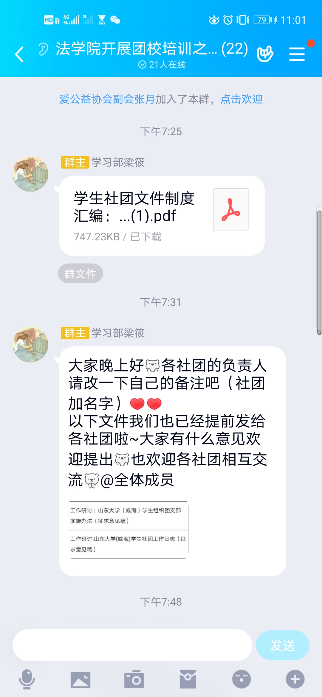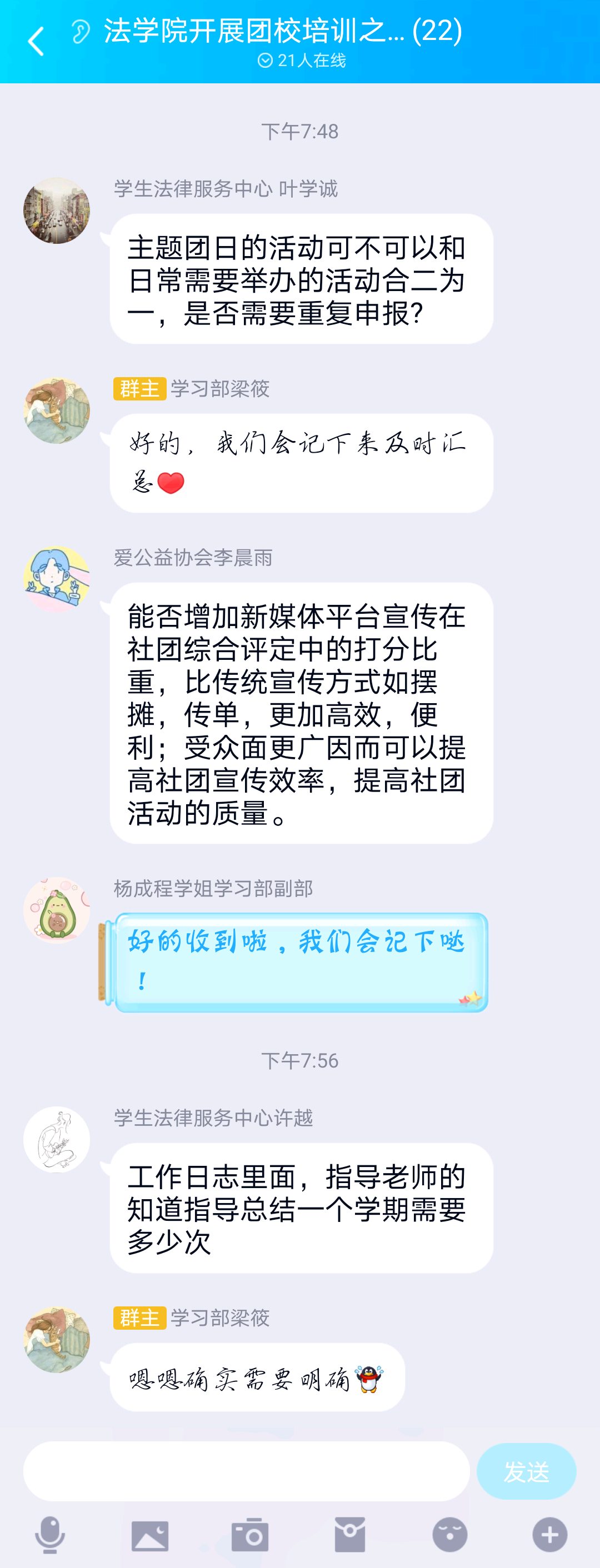 受疫情影响,本次社团制度建设专题培训在线上举行,虽然无法进行面对面交流,但并未影响各社团负责人对社团制度建设积极建言献策的热情。本次社团制度建设专题培训不仅收集了许多社团关于征求意见稿的意见,也增进了法学院各社团与学习部间的交流,为今后法学院社团工作开展及社团文化建设奠定了良好基础。