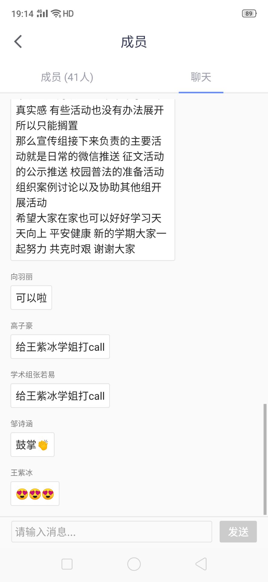 会上曾坤首先发言,她指出虽然大家受疫情影响暂时无法回校学习,但时间也更为充裕,因此更要摆正心态进入学习状态,把握时间自主学习,不要虚度光阴,徒增悔意。接着两位副主任依次进行发言。刘晓菁就中心近期活动提出了建议:在此特殊时期举办系列经典活动,应多创新线上形式,可以考虑多种形式相结合,让活动更加精彩丰富。此外大家也要合理利用互联网进行相互沟通,交流经验想法,及时解决工作中存在的问题。叶学诚提醒大家要在学习之余进行日常锻炼、保持作息规律,在疫情期间保持身体健康,也应利用难得的机会多陪家人,弥补以往在校不常与家人见面的遗憾。最后各组副组长依次发言,各自简短介绍了接下来的工作计划,表示各组都会在近期内有序开展主办活动。他们也鼓励大家积极参与其中,在共同努力中收获温暖,收获成长。