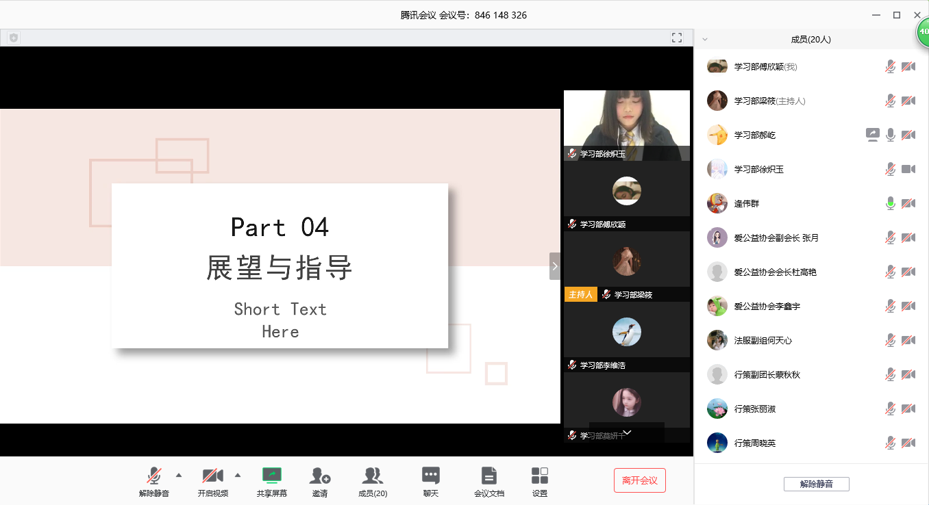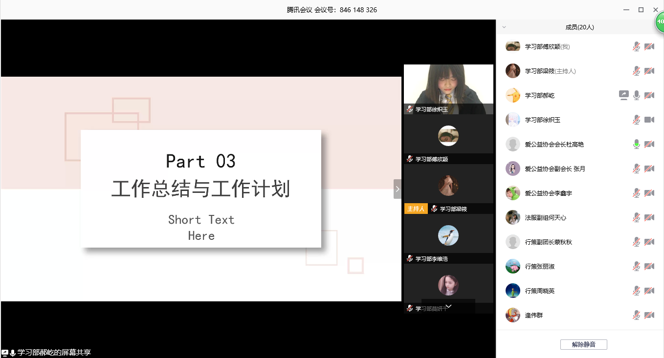 受疫情影响,本次社团恳谈会在线上举行,虽然无法进行面对面交流,但并未影响各社团负责人与学习部工作人员互相交流的热情。本次社团恳谈会不仅总结了上一学年社团发展的经验、明确了下一步社团工作的方向,也增进了法学院各社团与学习部间的交流,为今后法学院社团工作开展及社团文化建设奠定了良好基础。